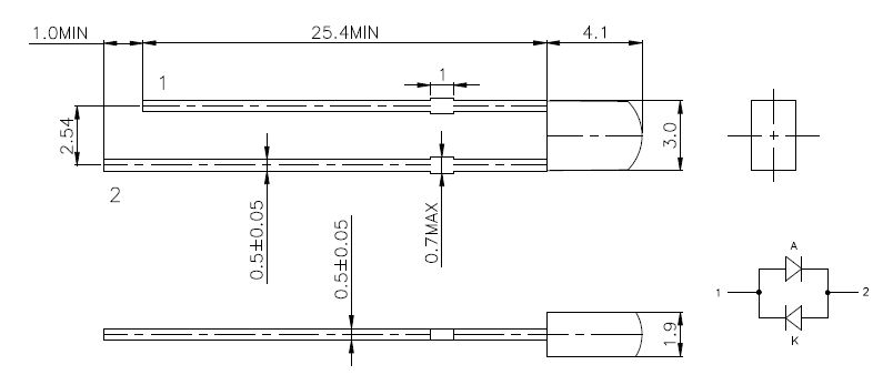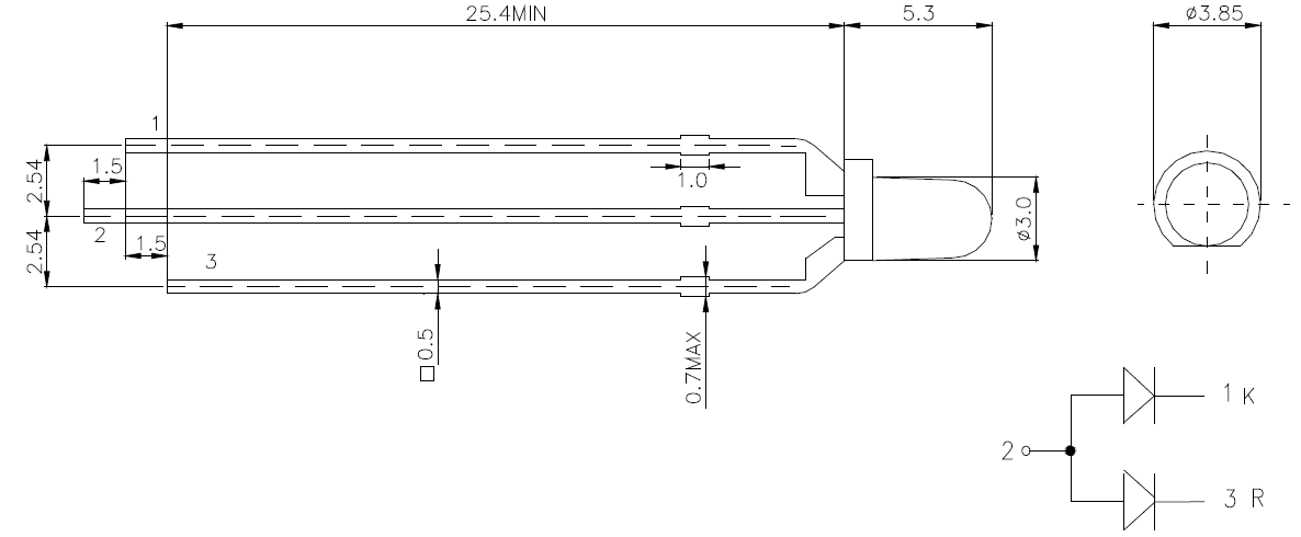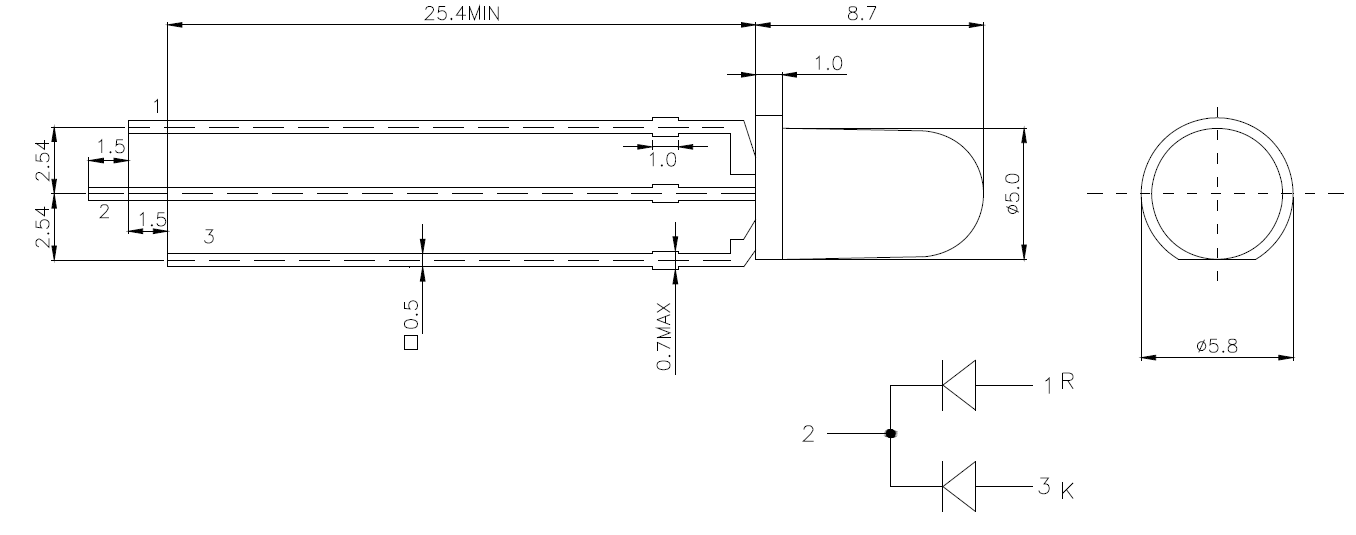 | 发光颜色(Colour) | 主波长(nm/K) | 光强(mcd) | 发光角度(Viewing angle) | 电压(V) | 电流(mA) | 胶体颜色(Lens Colour) | 引脚间距(mm) | 备注(Remark) |