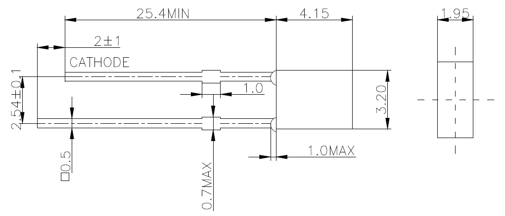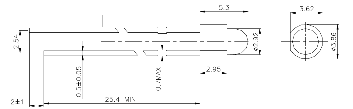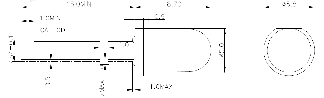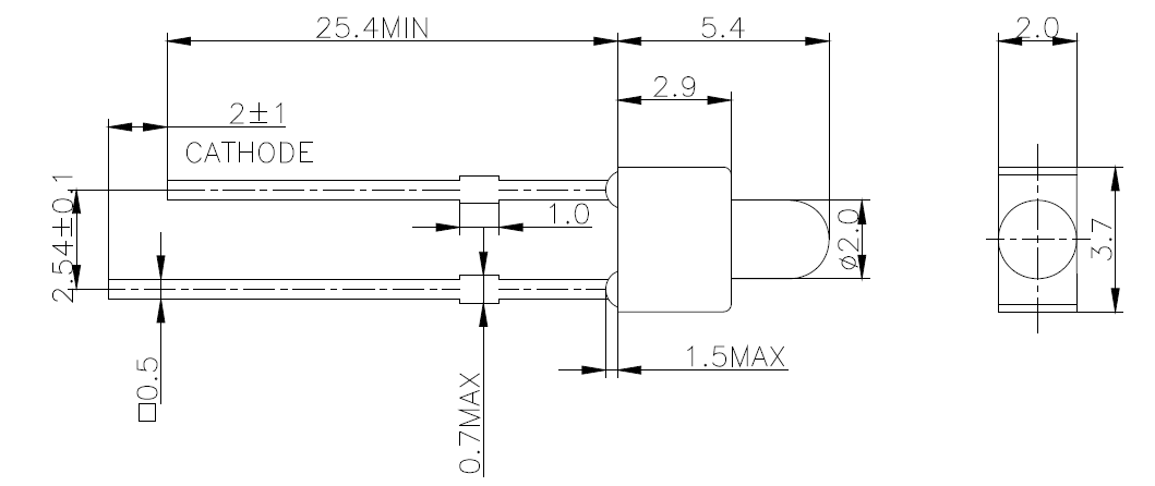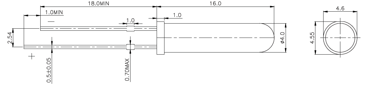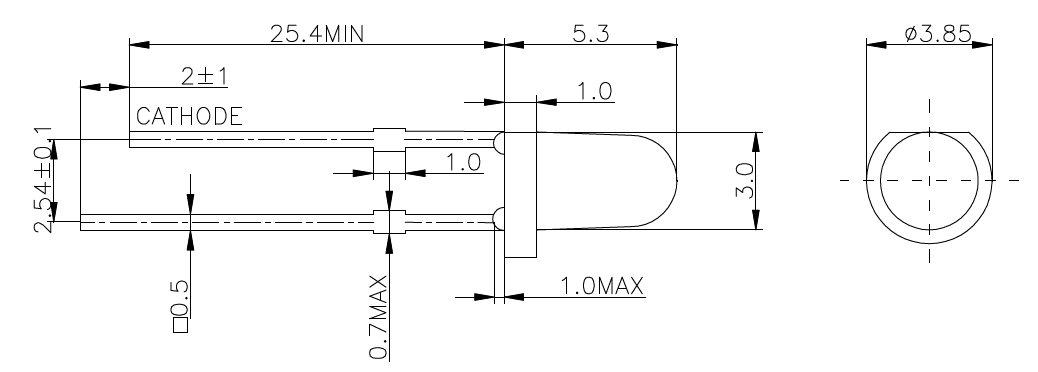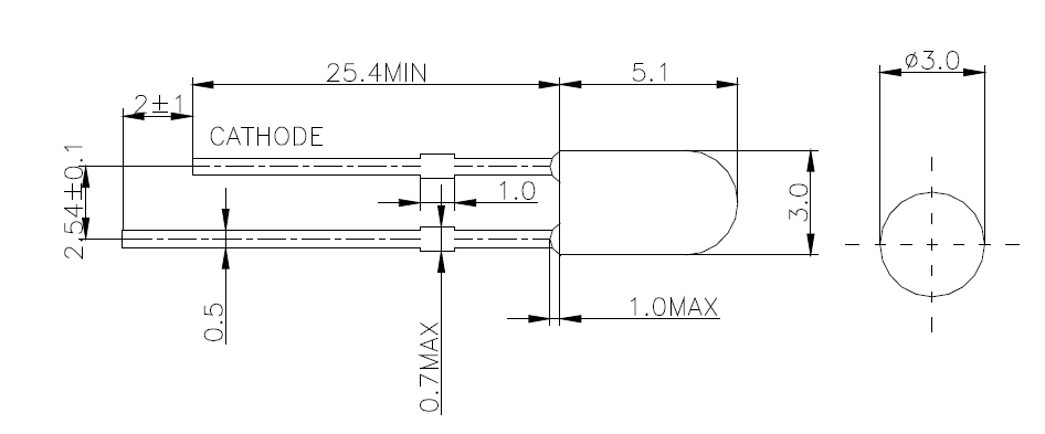 | 发光颜色(Colour) | 主波长(nm/K) | 光强(mcd) | 发光角度(Viewing angle) | 电压(V) | 电流(mA) | 胶体颜色(Lens Colour) | 引脚间距(mm) | 备注(Remark) |